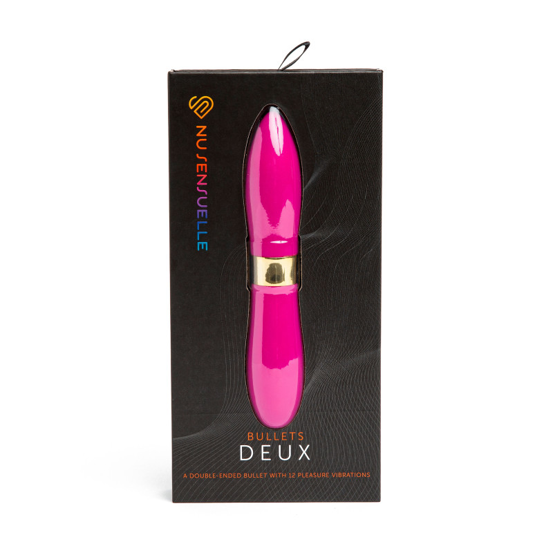 I Deux bulletS sono a doppia estremità, il che li rende multiuso. Ogni estremità del bullet sfoggia una forma distinta e contiene il proprio motore 60SX, che comanda 12 velocità di vibrazione. L'estremità appuntita del bullet è ottimale per la stimolazione puntuale, mentre la sua estremità più arrotondata fornisce una copertura massimizzata. Le possibilità sono infinite!