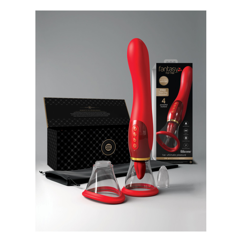 Her Ultimate Pleasure 24K Gold Edition presenta tutto ciò che ami dell'originale (22317 Her Ultimate Pleasure) mentre si pavoneggia in un ricco colore rosso limitato, uno straordinario accento placcato in oro 24K e include una borsa da viaggio deluxe, il tutto contenuto in una lussuosa confezione regalo perfetta per qualsiasi occasione.