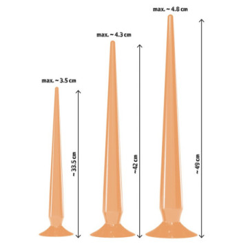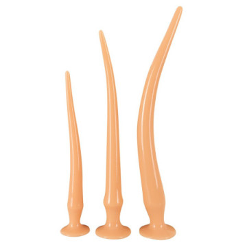 Trio di spine per un profondo piacere anale! Super Long Flexible Butt Plug Set by You2Toys: 3 x plug anali extra lunghi in diverse dimensioni e pesi. Ogni plug è molto flessibile e pieghevole con una punta stretta e sensibile e una base di aspirazione che serve anche da tappo. Dimensioni: Plug Small Lunghezza totale 33,5 cm, lunghezza d'inserimento 32 cm, Ø 1 cm - 3,5 cm, 161 g di peso. Plug Medium Lunghezza totale 42 cm, lunghezza d'inserimento 40,5 cm, Ø 1 cm - 4,3 cm, 268 g di peso. Spina Large Lunghezza totale 49 cm, lunghezza d'inserimento 46 cm, Ø 1,5 cm - 4,8 cm, 453 g di peso. PVC.