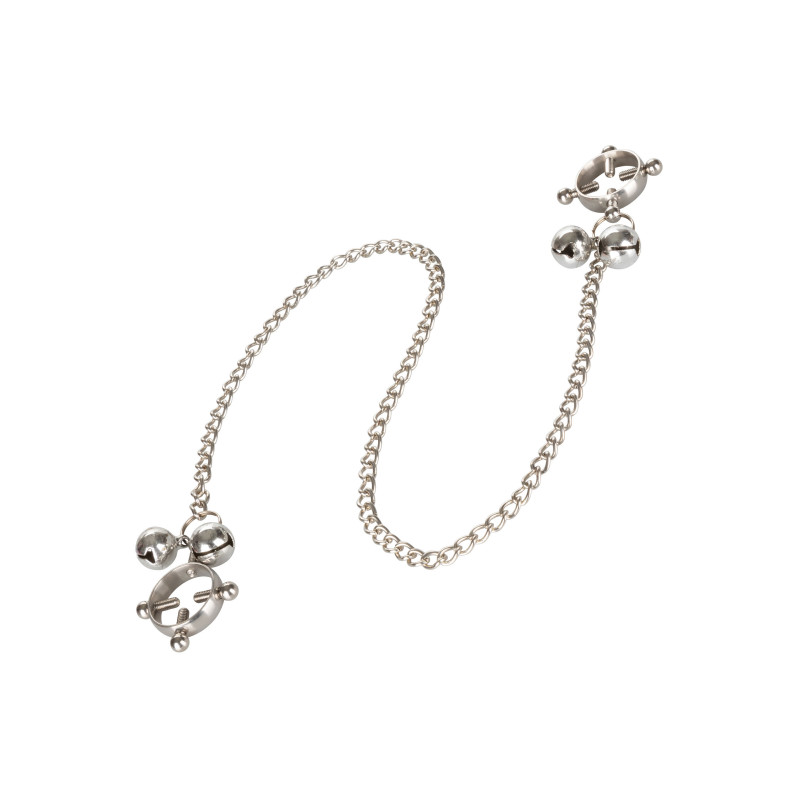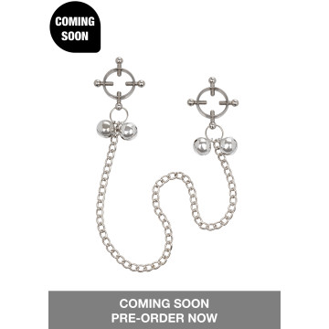 Aggiungi un po' di divertimento alla tua vita sessuale con il Nipple Grips 4-Point Nipple Press with Bells. Aumenta il tuo gioco con i capezzoli con una semplice rotazione delle viti. Stringi le viti esattamente alla pressione che desideri, e tira la catena per una soddisfacente sensazione di strattonamento con le campane che suonano con piacere. Include 2 morsetti multiuso completamente regolabili | Pressa a 4 punti con viti completamente regolabili | Campanelli e catena per una maggiore sensualità | Metallo resistente | Senza nichel