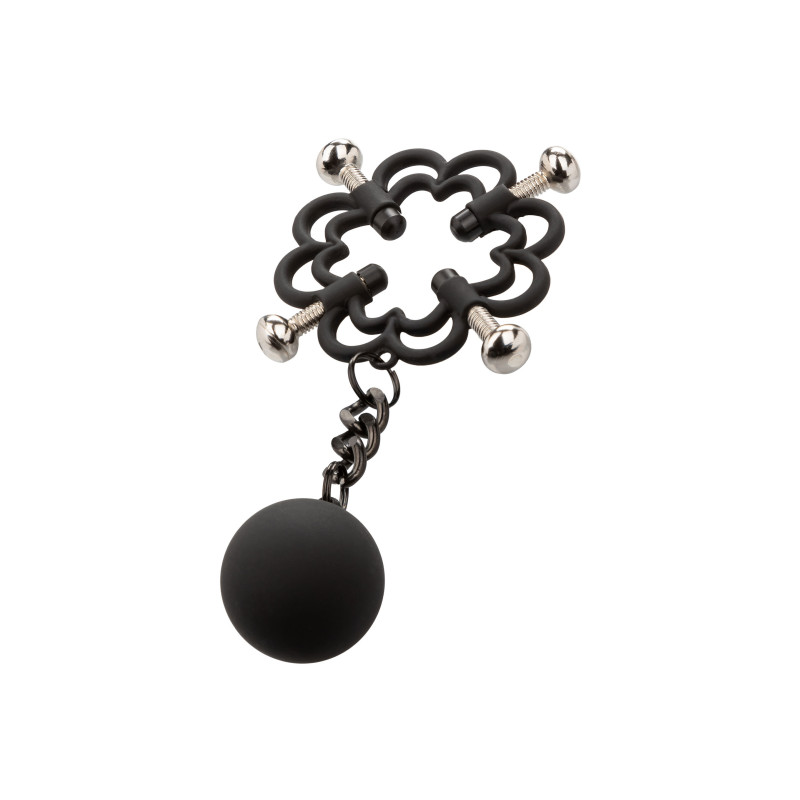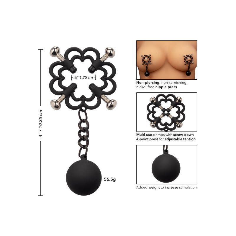 Pressa per capezzoli pesata Power Grip a 4 punti. Esplorate sensazioni elevate con i 2 morsetti multiuso completamente regolabili, la pressa a 4 punti avvitata e i pesi per stuzzicare. Raggiungete nuovi livelli di piacere giocoso con il pressa capezzoli a 4 punti con viti completamente regolabili ricoperte da un rivestimento in silicone Power Grip. Stringete i morsetti birichini al capezzolo o in qualsiasi punto del corpo e godetevi ogni scarica di dolore e piacere ad ogni strattone o oscillazione dei pesi. Il morsetto stuzzicante ha 4 punti di tensione completamente regolabili per stimolare qualsiasi punto del corpo per stuzzicare in modo giocoso. Man mano che si stringe la tensione, i brividi si intensificano a ogni giro di vite, per il massimo della stimolazione dei capezzoli. Questi stimolatori per capezzoli, facili da usare, sono ideali per lui, per lei o per loro.