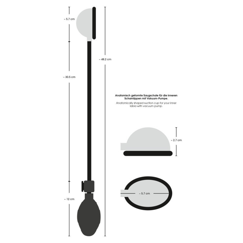 pompa a Ventosa sagomata anatomicamente per le labbra interne. Pompa per vuoto con valvola di scarico. Ventosa 5,2 cm, tubo flessibile lungo 30,5 cm. Nero / Trasparente. Materiale: silicone, ABS. Lascia che le piccole labbra escano alla grande! Ventosa sagomata anatomicamente e trasparente per le labbra interne. Premi la ventosa trasparente sagomata anatomicamente sul tuo centro di piacere e aziona la pratica pompa a vuoto con valvola di scarico: spettacolo emozionante e forte sensazione di piacere! Adatta per ogni vulva. Nero e trasparente. Ventosa lunga 5,2 cm, larga 2,7 cm (dimensioni interne). Tubo flessibile lungo 30,5 cm. Materiale: silicone, ABS.