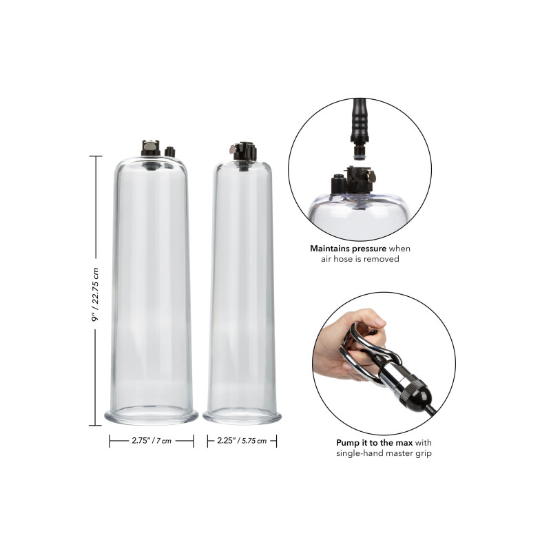 Ad ogni spremitura della pompa Master-Grip™ ad una mano, potrete sperare in un potente aumento della circonferenza e della lunghezza. Per darvi tutto lo spazio di cui avete bisogno per crescere, ogni kit comprende un cilindro grande e uno X-large con leve di rilascio rapido dell'aria. Il tubo dell'aria morbido e flessibile consente di cambiare cilindro della pompa, ma è progettato per mantenere la pressione dell'aria anche quando il tubo viene rimosso. Per ridurre o eliminare la pressione, basta premere il livello di rilascio dell'aria sulla punta.