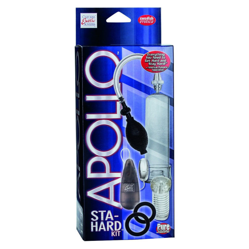 Tutto ciò di cui avete bisogno per diventare e rimanere duri!": così l'American Pumpers Association descrive il kit Apollo Sta-Hard. Se volete aumentare la vostra routine di allenamento, date un'occhiata a questo kit estremamente soddisfacente, che include la famosa pompa per erezione Sta-Hard. Questa pompa comoda e facile da usare è dotata di una base flangiata per una tenuta sicura, di una ciambella rimovibile morbida ed elastica e di un bulbo facile da spremere con una valvola di rilascio rapido dell'aria.Gli anelli in silicone sono disponibili in due misure per adattarsi a qualsiasi uomo. E lo stroker? È stretto ed elastico. Il kit viene fornito anche con un eccitante e gratificante stimolatore vibrante a più velocità.Naturalmente questo kit non è solo soddisfacente ed eccitante. È sicuro per il corpo, con un cilindro e una valvola di rilascio realizzati con il migliore ABS, mentre la ciambella e il masturbatore sono realizzati in TPR. Gli anelli sono in puro silicone e il tubo è in PVC privo di ftalati. Lo stimolatore è in ABS. Stile elegante, potenziamento e massimo piacere: questo kit ha tutto. Basta lasciarsi avvolgere dal cilindro e stringere la pallina per avviare l'aspirazione. Preparatevi a rimanere più duri, più forti, più a lungo. Questo maculinekit ha ciò che serve per ottenere ciò che si desidera.