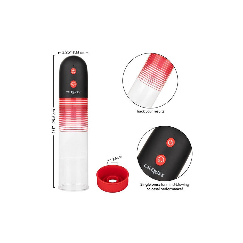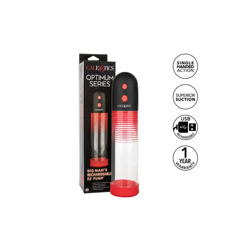 Una sola pressione per prestazioni colossali e strabilianti con la pompa ricaricabile EZ della serie Optimum Big Man, progettata per il piacere e per migliorare le tue prestazioni senza sforzo. Questa pompa automatica ricaricabile di grandi dimensioni offre un'aspirazione incredibile con la semplice pressione di un pulsante, garantendo i massimi risultati con il minimo sforzo. La pompa è dotata di una base ultra flangiata per una tenuta sicura, mentre il controller di facile impugnatura consente l'utilizzo con una sola mano, offrendo comfort e controllo. La ciambella in silicone rimovibile e sicura per il corpo garantisce un'esperienza comoda e avvolgente, aumentando il piacere durante l'uso. Grazie al pulsante di rilascio rapido dell'aria, puoi gestire facilmente la pressione per una sessione completamente appagante.