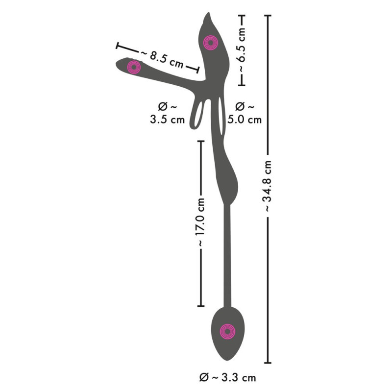 5 giocattoli in uno per un climax condiviso! Il vibratore di coppia multifunzione RC di Coup!es Choice sostiene il pene e coccola le coppie durante il sesso con vibrazioni profonde. Non meno di 5 giocattoli sono combinati in questo multi-talento: Anello per pene e testicoli, vibratore di coppia, vibratore clitorideo e plug anale vibrante. 10 diverse modalità di vibrazione possono essere percepite intensamente da entrambi i partner. Possono essere comodamente controllate con il pratico telecomando. Portata 10 metri. I 3 motori silenziosi possono essere controllati anche separatamente direttamente sul toy. Perfetto anche per il divertimento nella vasca da bagno e nella doccia, perché è impermeabile! È molto facile da usare: l'anello per pene e testicoli si infila in modo che il vibratore di coppia piatto si annidi sopra il pene. Questo permette a lui di godere di un pene più grosso durante il sesso e di sentire lui stesso una meravigliosa tensione. Inoltre, l'anello per il pene sostiene l'erezione a lungo grazie all'effetto di congestione del sangue. L'anello per testicoli assicura una presa sicura e una trazione eccitante. Il vibratore clitorideo, delicatamente stuzzicato, coccola il punto caldo di lei durante il sesso. Il vibroplug viene inserito analmente, sia da chi lo indossa sia per una stimolazione anale supplementare del partner. Realizzati in silicone morbido come la seta, gli anelli elastici sono facili da infilare e il vibratore di coppia e il plug vibro-anale sono facili da inserire. La leggera combinazione vibrante si adatta perfettamente al corpo e segue flessibilmente tutti i movimenti. Ricaricabile - inclusi cavo di ricarica USB e batteria (CR2032) per il telecomando. Lunghezza totale 34,8 cm. Anello per il pene Ø 3,5 cm, anello per i testicoli Ø 5 cm, entrambi estensibili. Vibratore di coppia lunghezza di inserimento 8,5 cm, larghezza 2,3 cm. Vibratore clitorideo lungo 6 cm. Plug vibro-anale lungo 5,5 cm, Ø massimo 3,3 cm, barra di collegamento lunga 17 cm. Peso 129 g. Silicone, PU.