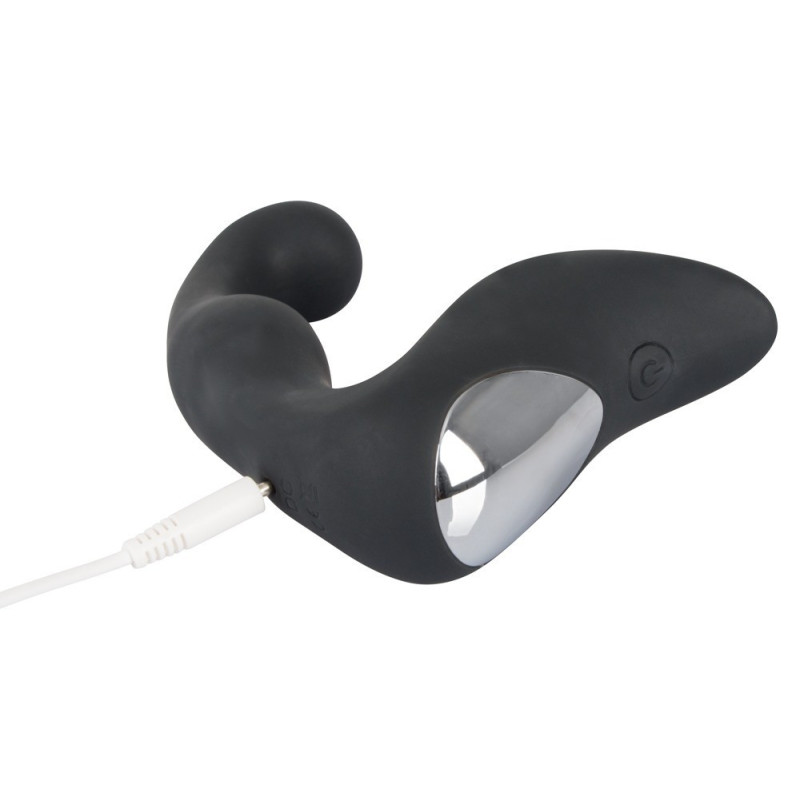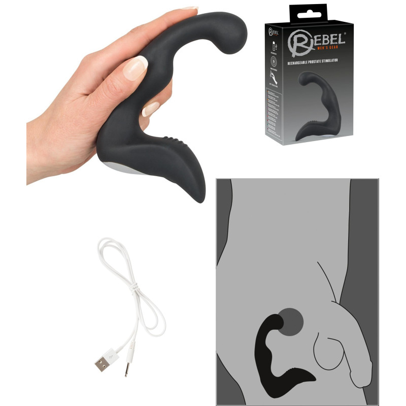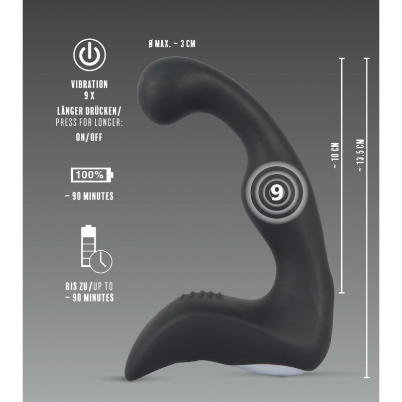 Vibratore prostatico flessibile con testa curva, asta sferica e stimolatore perineo con scanalature stimolanti. 9 modalità di vibrazione. Ricaricabile con presa USB inclusa. Nero. Lunghezza totale 14,6 cm, profondità di inserimento 10,5 cm, Ø 2-3 cm; Spanditore perineo lungo 9 cm. Materiale: silicone con rivestimento in poliuretano, ABS, senza ftalati secondo il Regolamento UE 1907/2006 / CE.