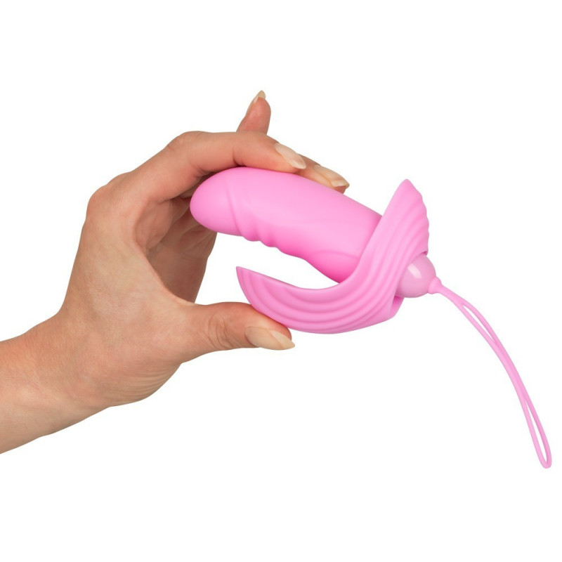 La vibrazione del sussurro in 7 passaggi può essere controllata premendo un pulsante sul pratico radiocomando di piccole dimensioni. Con cinturino appeso. Rosa. Conchiglia di circa 6 x 10 cm. Vibratore lungo 7,5 cm, Ø 3 cm. Materiale: silicone Batterie incluse