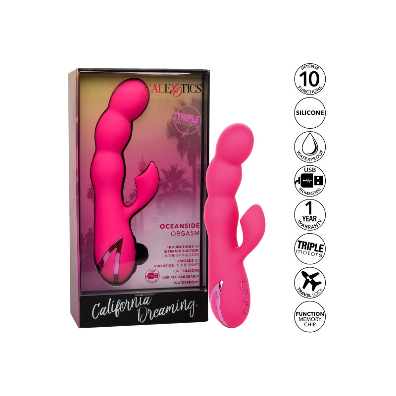 La giocosa California Dreaming Collection dà vita a fantasie baciate dal sole con il meraviglioso Oceanside Orgasm. Questo massaggiatore dal design unico è pronto a farvi rivivere le vostre fantasie estive preferite con 10 potenti funzioni di aspirazione clitoridea e 3 velocità di vibrazione da far tremare le ginocchia. Mentre le vibrazioni tremolanti fanno la loro magia, la punta di aspirazione a copertura totale offre una stimolazione di aspirazione da far tremare le ginocchia.