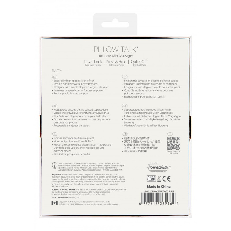 l proiettile Racy è un potente mini massaggiatore che offre incredibili vibrazioni per stimolazioni esterne o punti G Racy ti permette di esplorare il lato selvaggio ed è convenientemente compatto per portare le tue avventure in movimento Con una maniglia trapuntata con un pulsante abbagliante in cristallo Swarovski Racy combina lusso e potenza per offrirti il massimo del piacere. Profonda vibrazione PowerBullet. Controllo incrementale della velocità per potenza precisa. Materiale Sililcone. Dimensioni 5 pollici x 87 pollici. Cavo USB ricaricabile incluso. Tempo di ricarica. 3 ore. Tempo di esecuzione.
