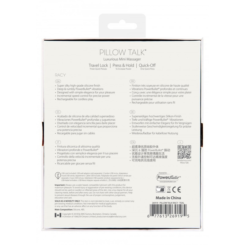 l proiettile Racy è un potente mini massaggiatore che offre incredibili vibrazioni per stimolazioni esterne o punti G Racy ti permette di esplorare il lato selvaggio ed è convenientemente compatto per portare le tue avventure in movimento Con una maniglia trapuntata con un pulsante abbagliante in cristallo Swarovski Racy combina lusso e potenza per offrirti il massimo del piacere. Profonda vibrazione PowerBullet. Controllo incrementale della velocità per potenza precisa. Materiale Sililcone. Dimensioni 5 pollici x 87 pollici. Cavo USB ricaricabile incluso. Tempo di ricarica. 3 ore. Tempo di esecuzione.