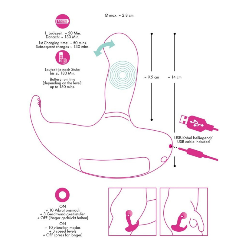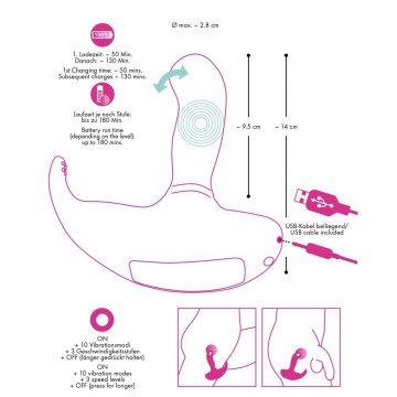 Lasciati convincere da questo vibratore rosa con un braccio stimolante e una palla "toccante" sulla punta - per stimolare il punto G e il clitoride o la prostata e il perineo. 8 modalità di vibrazione ti mettono anche ritmicamente in estasi. Ricaricabile con il cavo USB incluso