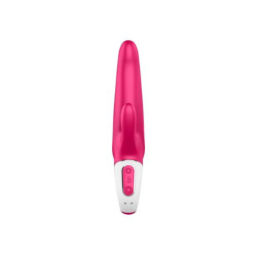 Vibratore rabbit di design di colore fucsia Satisfyer Mr. Rabbit. Privo di ftalati. E' realizzato in silicone morbido di alta qualità ed ha un motore potente e silenzioso a 12 programmi con 6 intensità e 6 modalità facilmente selezionabili. E' inoltre impermeabile e ricaricabile tramite USB.
