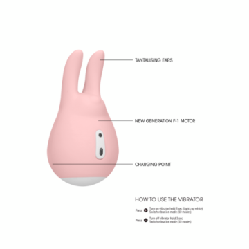 Le orecchie orgasmiche e sconvolgenti di questo mini massaggiatore clitorideo rabbit sono delicate ma dinamiche e rendono questo giocattolo clitorideo ideale per il gioco in solitaria o in coppia. Si adatta al palmo della mano e le 2 punte arrotondate di uguale forma vibrano attraverso i suoi 2 maestosi punti di vibrazione a ben 7.500 giri al minuto. Dispone di 10 funzioni di vibrazione uniche, è impermeabile, estremamente silenzioso a soli 60dB e contiene una batteria ricaricabile che può essere ricaricata completamente con il suo cavo USB in soli 120 minuti e fornirà ben 100 minuti di gioco appassionato! È realizzato al 100% in morbidissimo silicone per uso medico e contiene un fondo e un pulsante di accensione in ABS termoplastico privo di ftalati.