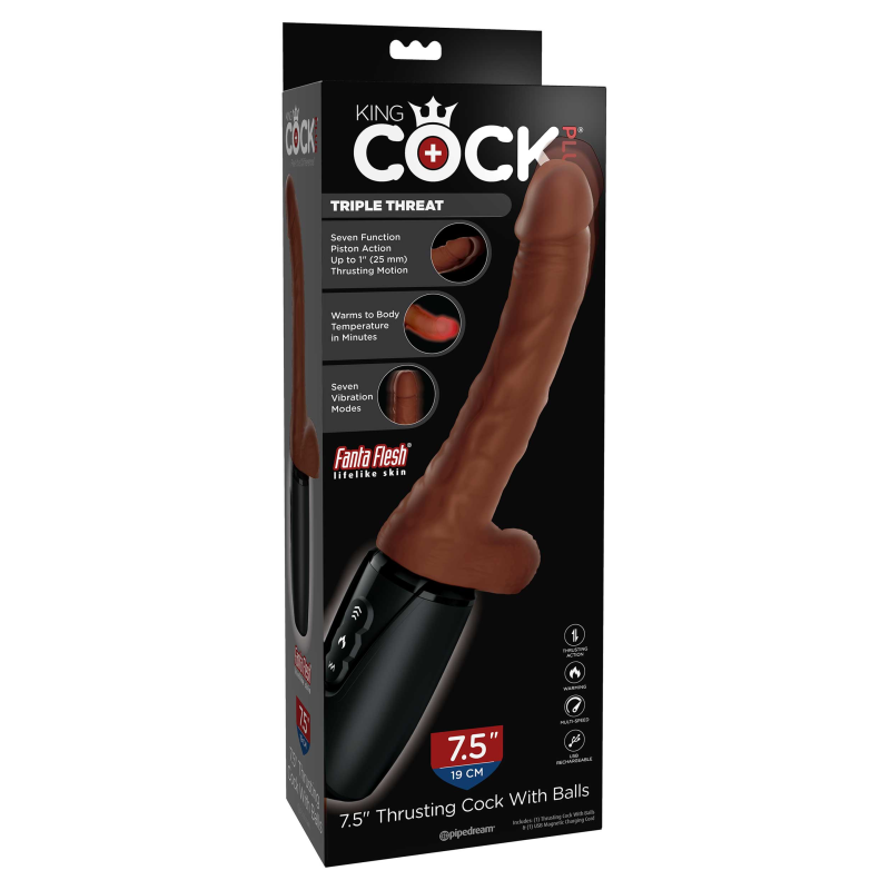 Senti la differenza! Il King Cock Plus Thrusting Cock With Balls è veramente una tripla minaccia che dispone di 1' di movimento di spinta a pistone profondo, riscaldamento interno fino alla temperatura corporea in pochi minuti, e potenti vibrazioni stimolanti per l'esperienza definitiva. Thrusting pleasure è progettato per essere naturalmente reattivo, massaggiando ogni tuo movimento, veloce o lento. La semplice pressione di un pulsante attiva le 7 funzioni uniche del motore vibrante, che è strategicamente posizionato sulla punta del Thrusting Cock per un piacere puntuale all'interno e all'esterno. Per una stimolazione ottimale, la vibrazione dinamica combinata con l'azione di spinta reattiva e il riscaldamento interno crea risultati orgasmici esplosivi ogni volta!