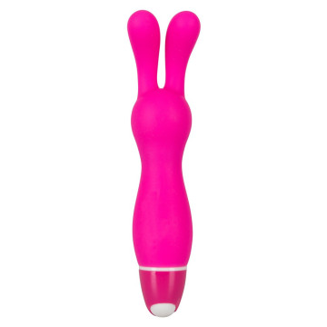 Vibratore a forma di coniglio con orecchie mobili. Vibrazione silenziosa in 7 fasi con la semplice pressione di un pulsante. Rosa. Lunga circa 14 cm, Ø 1,7-2,6 cm. Materiale: silicone, ABS. Comprese le batterie a bottone.
